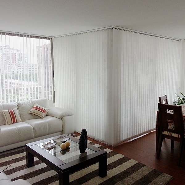 Las cortinas verticales son láminas de tela de 89 mm que cuelgan desde un cabezal rotatorio y de desplazamiento que hace de este tipo de cortinas una de las mas versátiles para distintos ambientes.